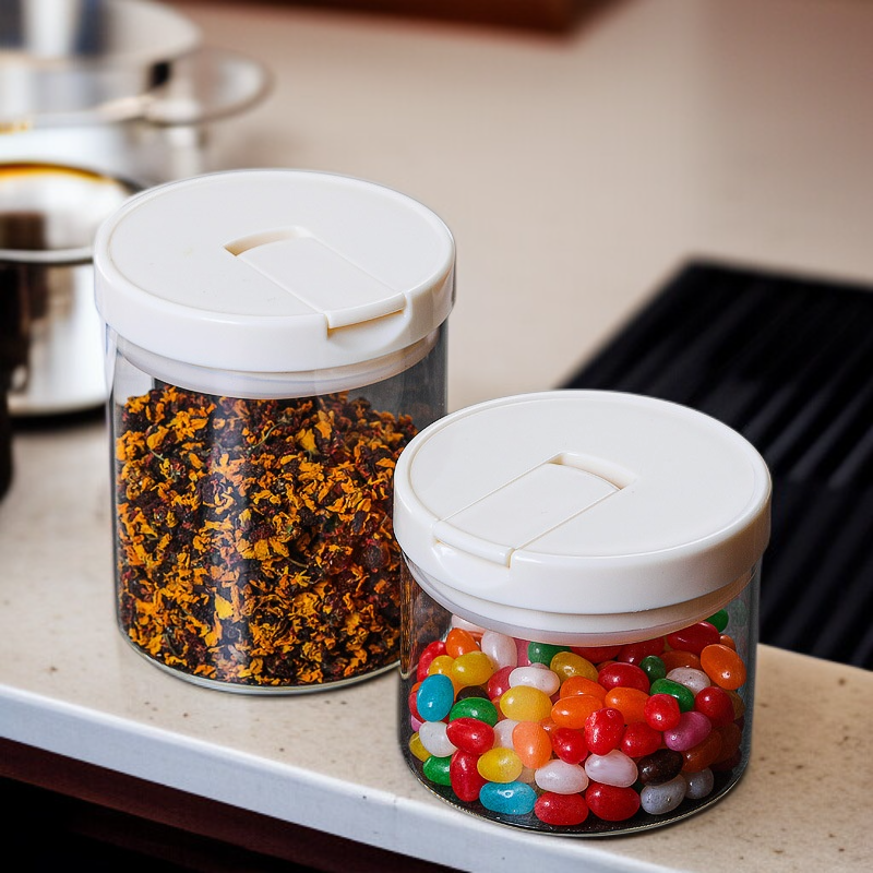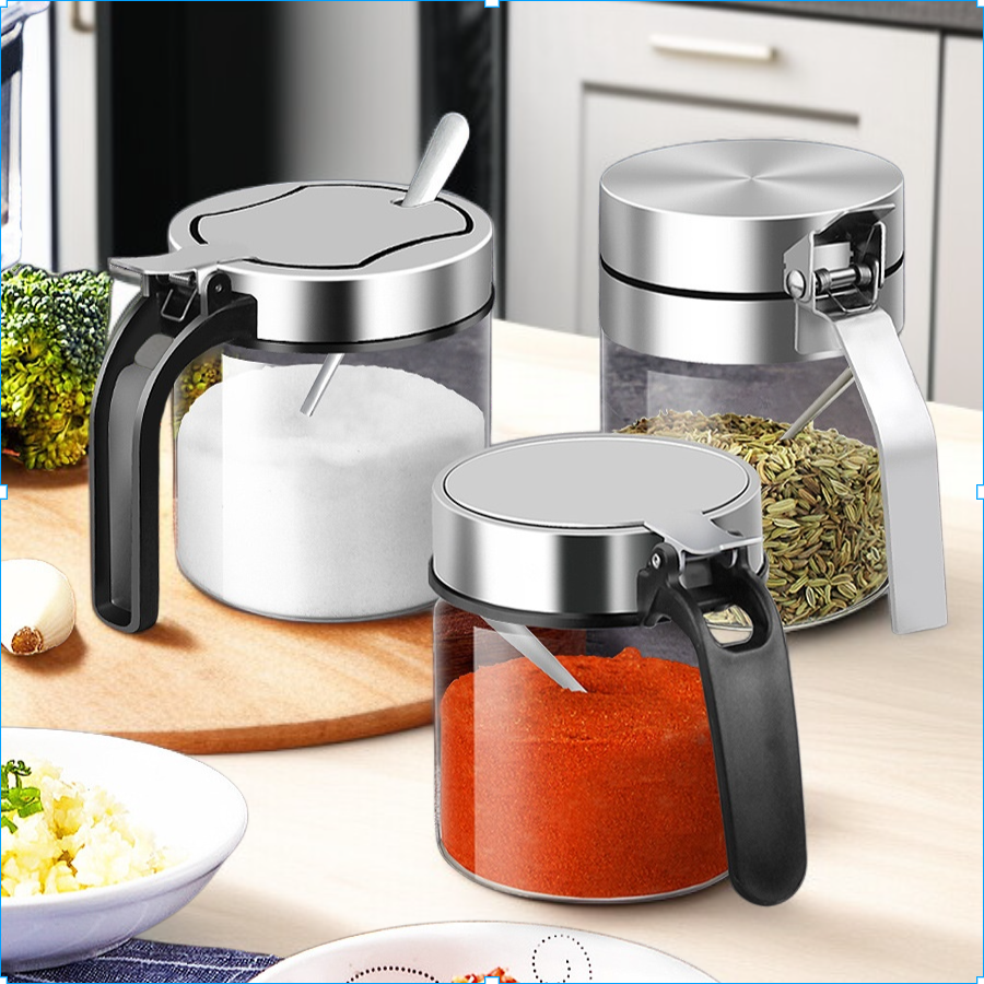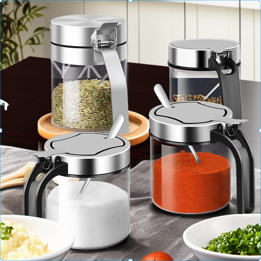 Glass seasoning bottle jar for kitchen storage. Organize salt, chicken essence, and spices. Clear, durable design for hotels or home. Convenient access and easy to clean.
