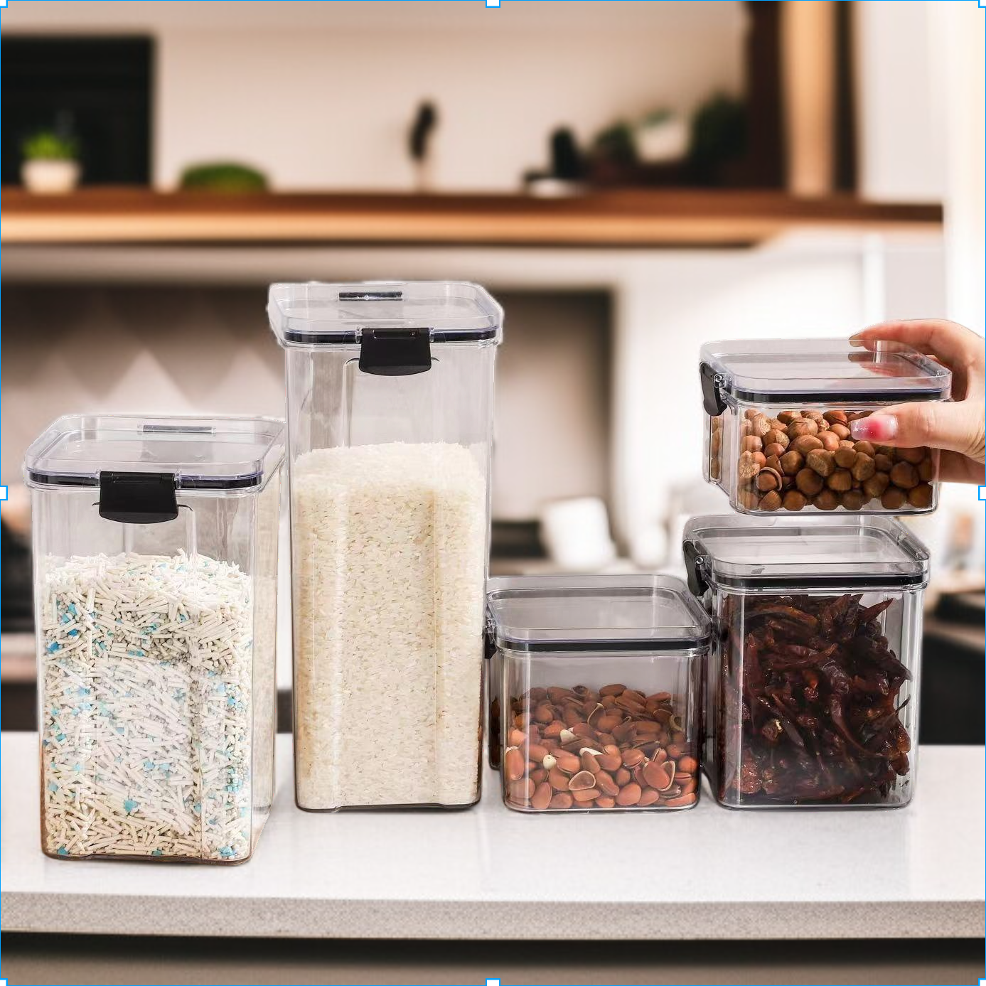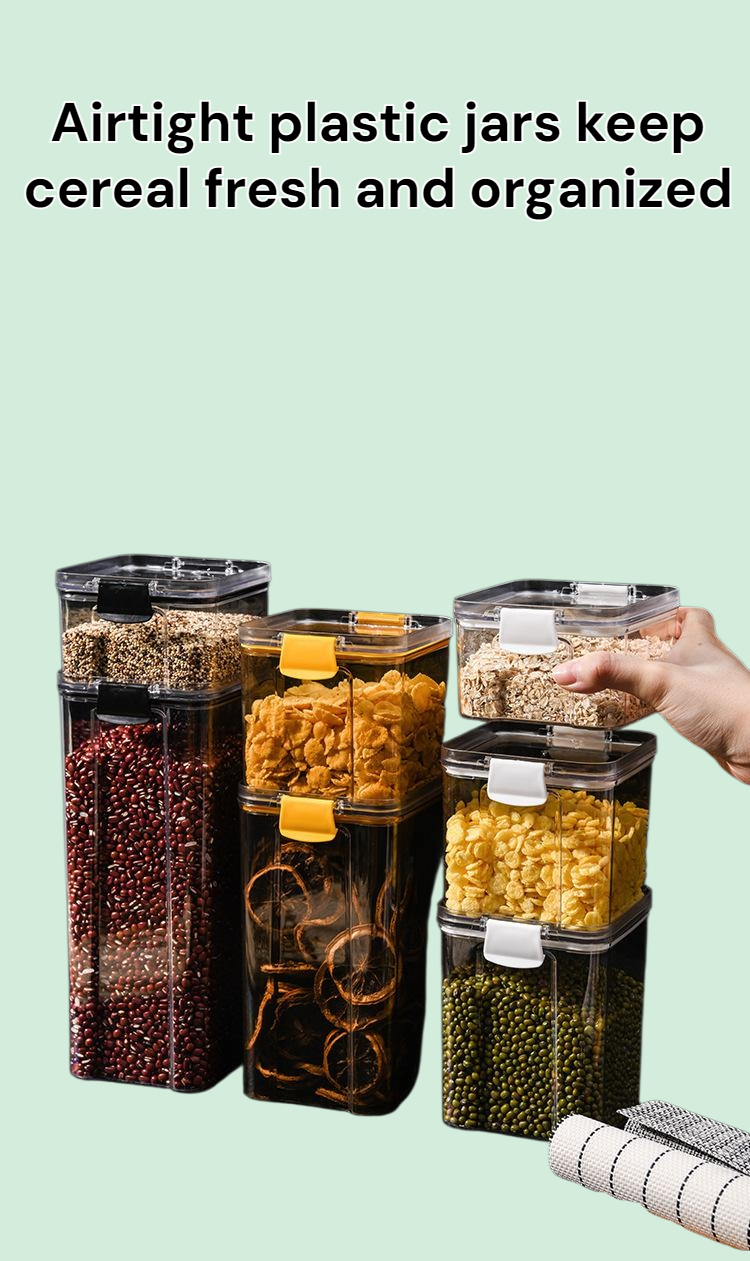 Sealed plastic jars keep grains fresh and organized. Transparent design allows easy content identification. Suitable for kitchen storage. Durable and easy to clean. Multiple sizes available.